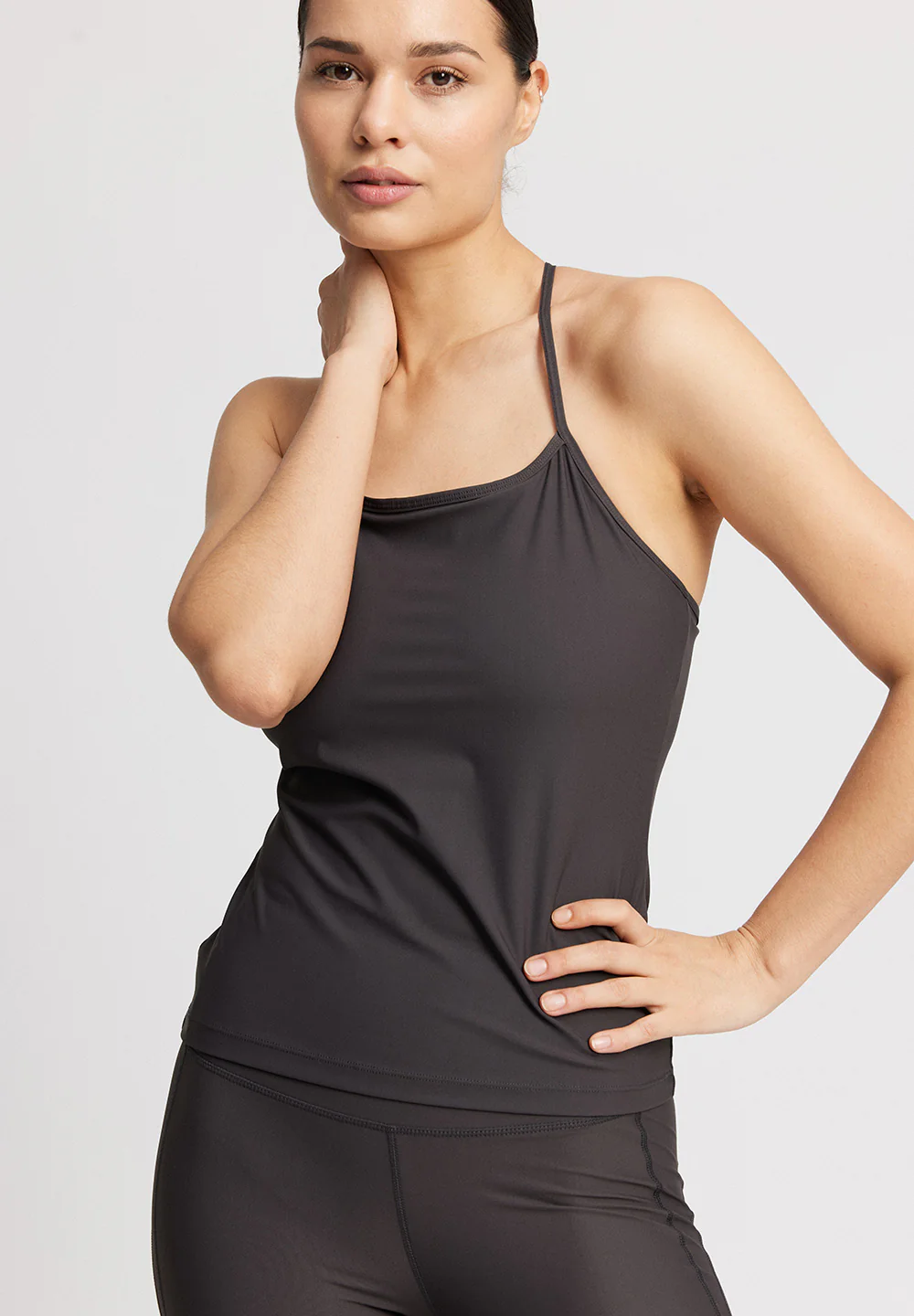 Toppen er i et blødt mat genanvendt stof og er meget let og strækbar. Den har tynde justerbare stropper som krydser på ryggen. Toppen har en løs A-form og er lavet med usynlige sømme for et sømløst og simpelt look. Den løse pasform gør det behagelig for dig at have på og bevæge dig i. Den er perfekt til en varm sommerdag eller en yogatime.