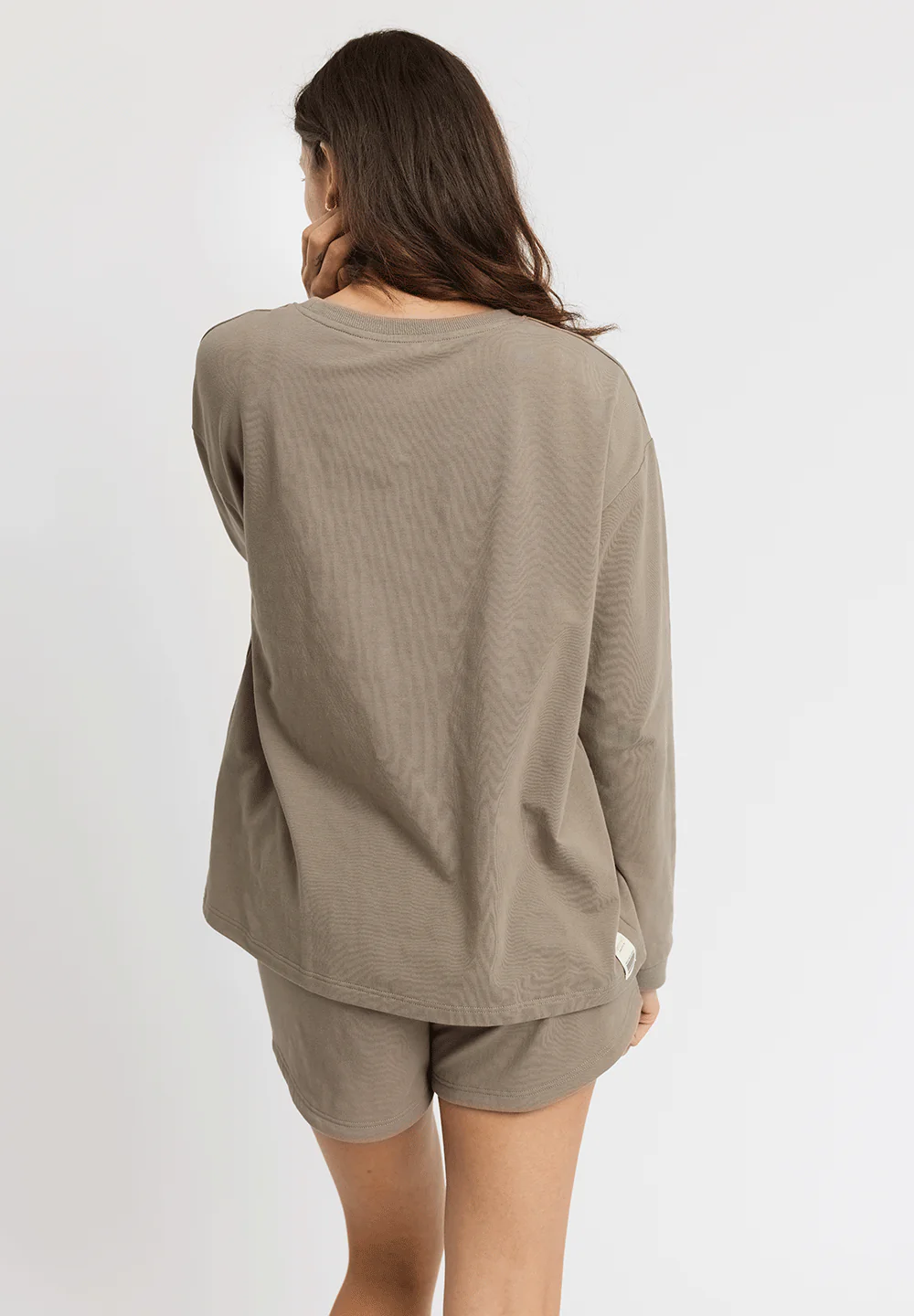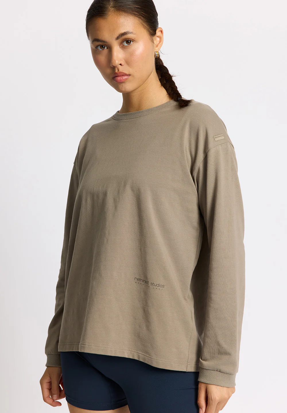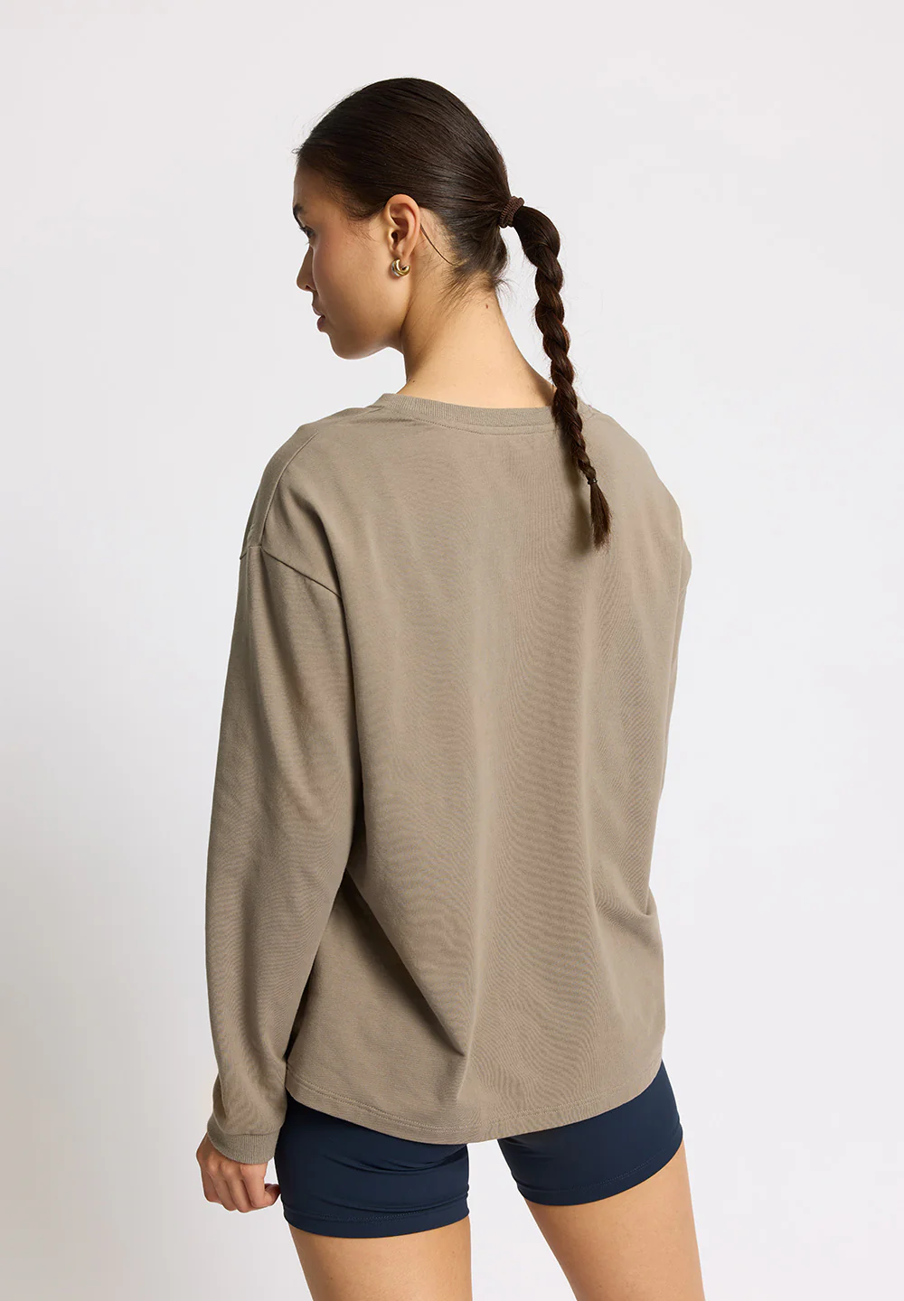 Klassisk langærmet T-shirt i et tyndt sweatshirt-materiale. T-shirten har et cool ’Amerikansk College’ look med en lettere oversize pasform, ribkanter og delikate logo details. Det bløde materiale gør den behagelig for dig at have på og bevæge dig i. En sand favorit, der er lavet til at blive levet i.